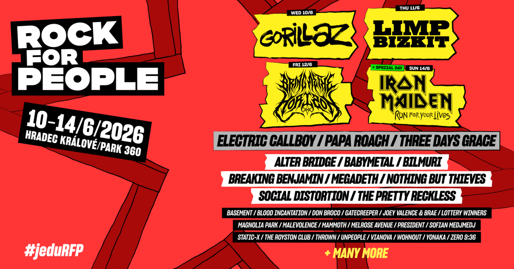 Rock for People announces two more headliners and a package of bands that will perform from June 10 to 14, 2026, at the 31st annual festival in Hradec Králové’s Park 360. After nine years, Czech fans can look forward to a show by the unique virtual band Gorillaz, winners of Grammy and BRIT Awards, among others, which will be the highlight of the first day of the festival. Thursday’s headliner will be nu metal legends Limp Bizkit, led by charismatic frontman Fred Durst. The organizers have yet to reveal the fifth and final headliner, who will join the already announced Iron Maiden and Bring Me The Horizon. “It’s great to see the lineup growing before our eyes. Having four headliners for next year finally confirmed and announced in mid-October is every organizer’s dream,” says festival founder Michal Thomes, adding: “And this is just the beginning, with over 200 performers set to appear at the festival, so there’s definitely more to look forward to.” The second announcement brought more star names such as British rockers Nothing But Thieves, Czech audience favorites Three Days Grace, hot trend girl trio Babymetal, and one of the most prominent Czech artists of the younger generation, Sofian Medjmedj. The organizers note that interest in tickets is high and the current edition is close to selling out.